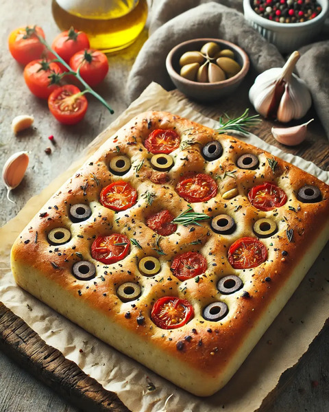 This is another classic traditional Italian topping for focaccia. You can use whole or sliced green or black olives with some freshly sliced garlic.